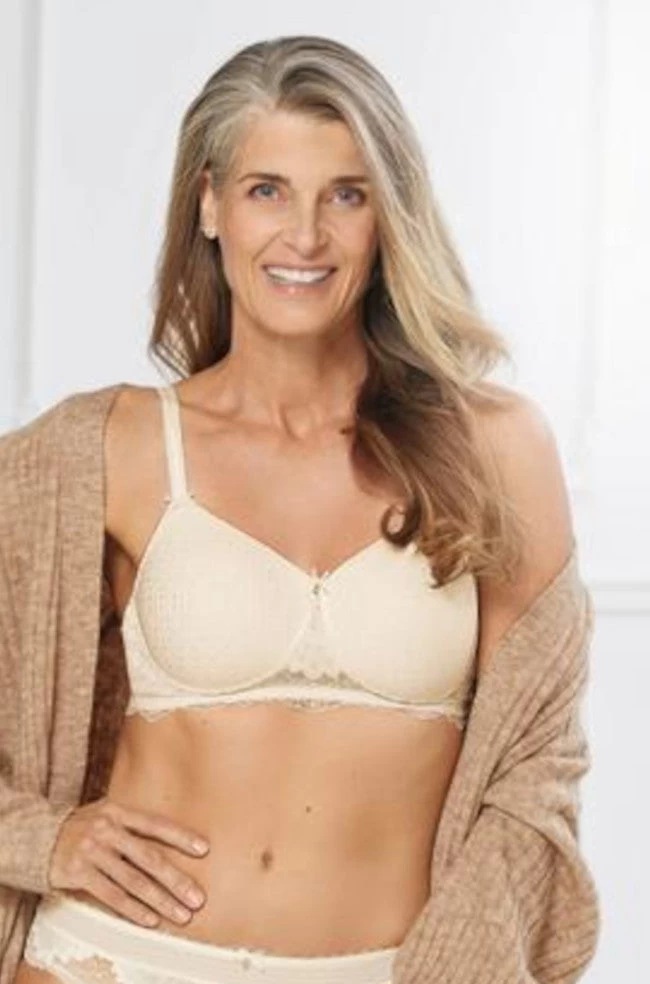 Aurelie Lightly Padded Wirefree Bra by Amoena in a lovely off white colour features delicate lace detail and petite lace piping. Hidden pockets to accommodate fillers or prostesis. Team with the