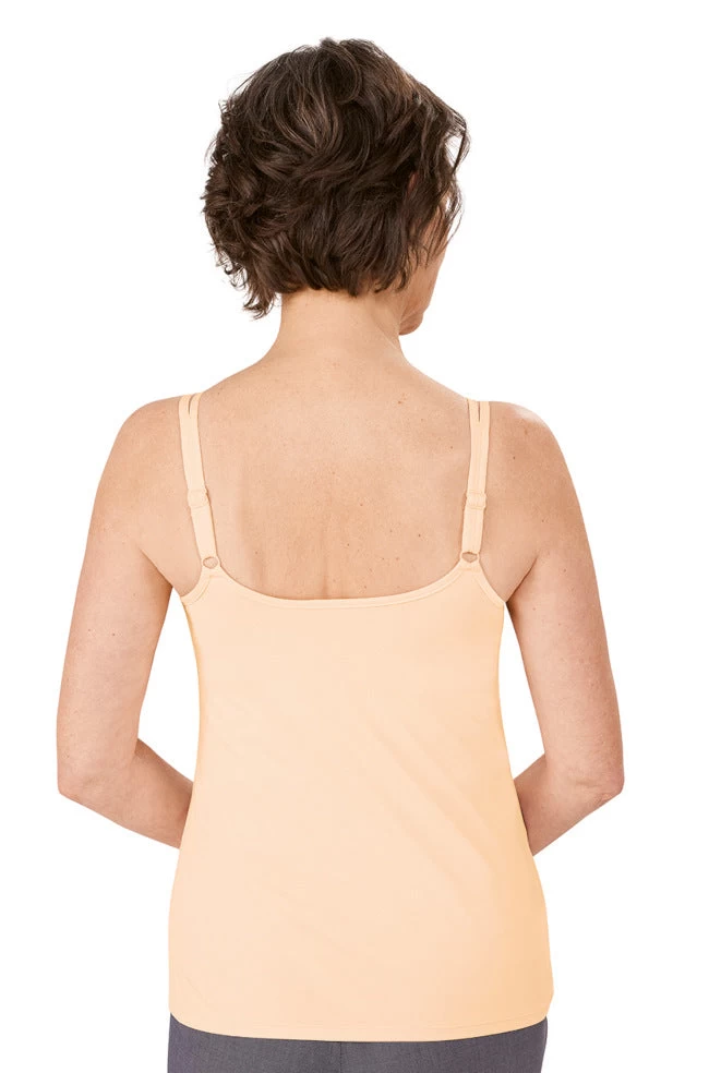 The Valletta Top by Amoena in peach is manufactured in a lovely soft modal fabric and features adjustable twin straps and has built in pocketed shelf support. Available in sizes S-2XL.