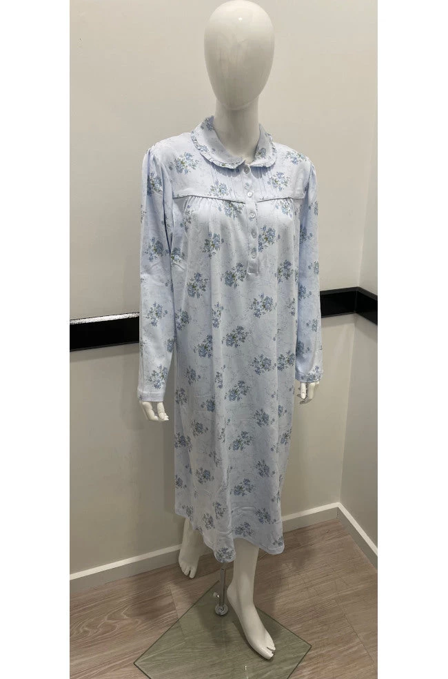 Arabella Cotton Nightie in a blue floral print by Givoni features a ruffled Peter Pan collar, long sleeves and a five button front opening. Manufactured in a soft warm 100% stretchy cotton makes this the perfect choice for those cooler times.