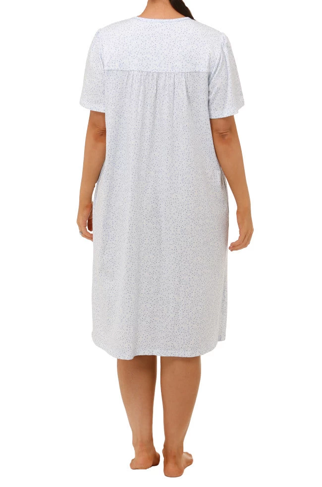 Ditsy Brunch Coat by Schrank in a petite blue floral print is manufactured in an easy care stretchy soft touch poly/cotton fabric blend and features a round neckline with a six button opening and a pleated yolke. Available in sizes 10-26.