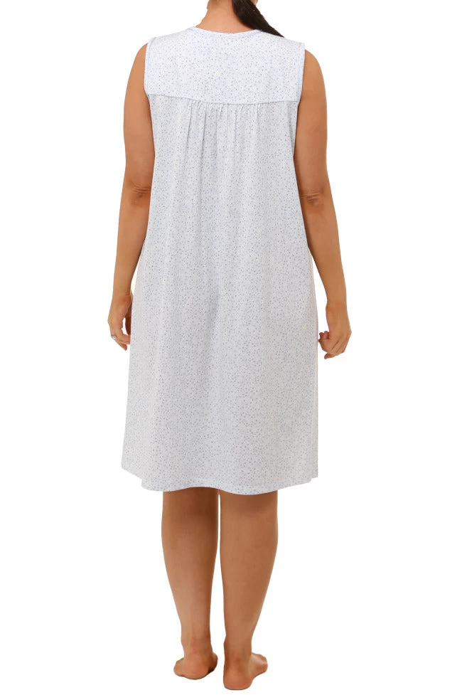 Ditsy Sleeveless Nightie by Schrank in a petite blue floral print is manufactured in an easy care stretchy soft touch poly/cotton fabric blend and features a round neckline with a six button opening and a pleated yolke. Available in sizes 10-26.