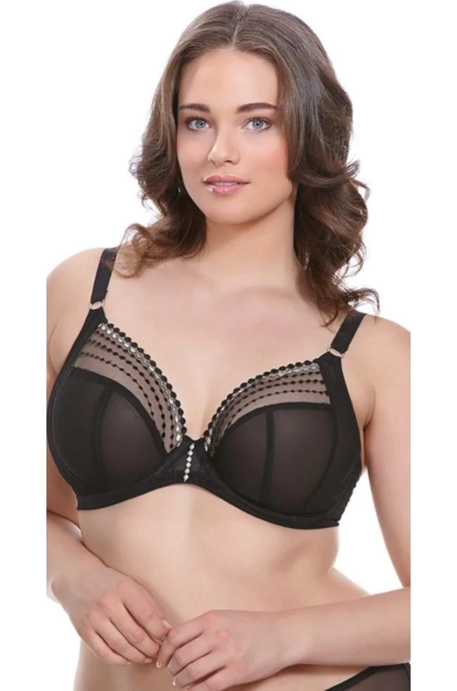 Matilda Plunge Bra in black by Elomi features contrasting white embroidery beads. Can be worn as a racer back for additional support. A great choice for larger busts that require additional support. Team with