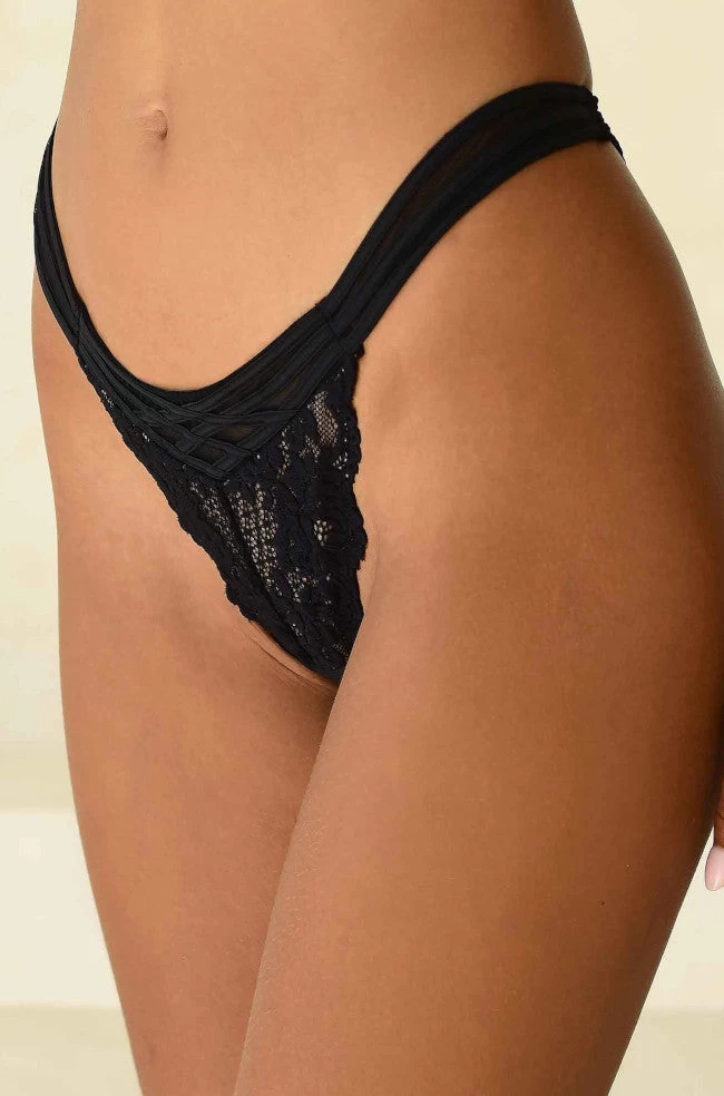 Filigree G-String by Naran in black features a decorative crossover waistband and scalloped lace edging. Team with the matching
