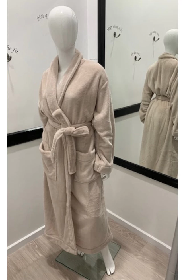 Fluffy Robe in a light stone colour by Morning Honey in a light pink colour features a full front opening, side pockets and a matching tie belt. Manufactured in a soft, warm, fluffy polyester fabric that feels so soft you wont want to take it off. Available in sizes S-M and L-XL.Â