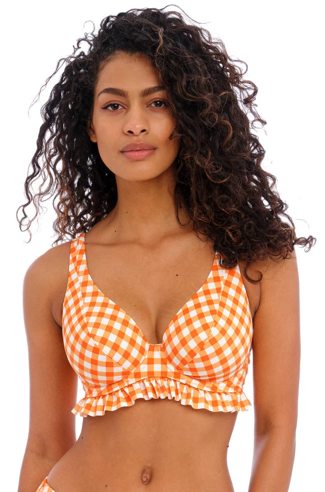 Kicking off the new season, Check In is back. The gingham pattern and frill details are giving us serious 60’s vibes, now with a twist, in a zesty bright orange colourway. With a print so good, we just had to make this collection in a selection of styles. Featuring a full bust underwire style with great support, gathered below the bust, fully adjustable comfortable straps with a J hook to provide additional support if required (think crossover bra) Team with the