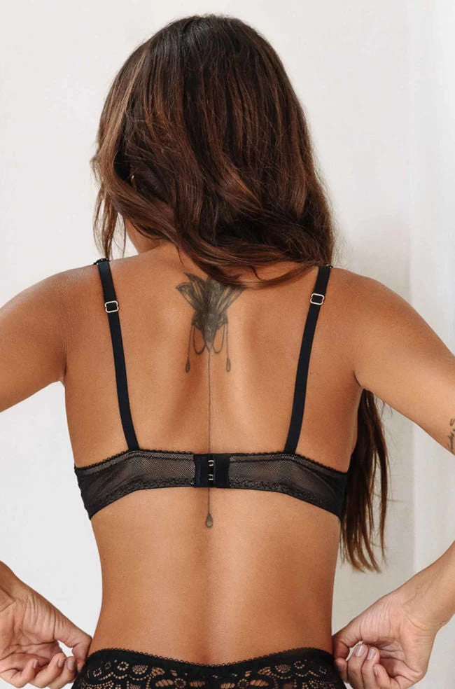 Goddess UW Balconett Bra by Naran in a classic black colour is a contour balconett bra with style. Featuring Bohemian style stretch lace and lightly padded cups for lift and a great shape. Team with the