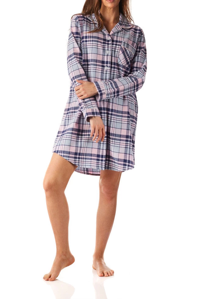 Isabella Flannelette Cotton Nightshirt by Magnolia Lounge in a check pattern features long sleeves and a full front button opening. Available in sizes S-2XL.