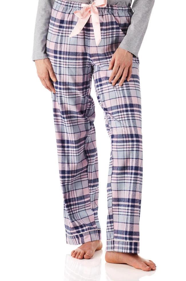 Isabella Flannelette Cotton PJ Set in a check print is a classic cut PJ set. The top has long sleeves, full button front opening and a single breast pocket . The full length bottoms have an elasticated waist and a wide tie ribbon. Available in sizes S-2XL.