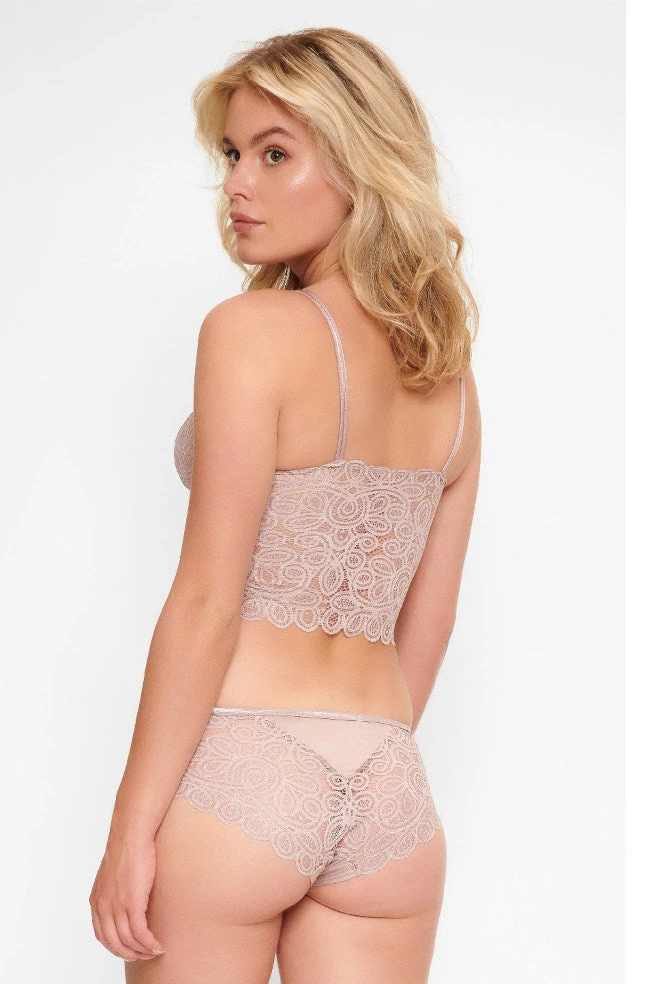 Elegance Wirefree Bralette Crop Top by Lingadore in the new bark colour features scalloped semi-sheer lace detail and twin spaghetti straps. Team with the matching Briefs, the matching French Knickers, the matching Thong and add the Kimono to complete the set. Available in sizes S-XL.