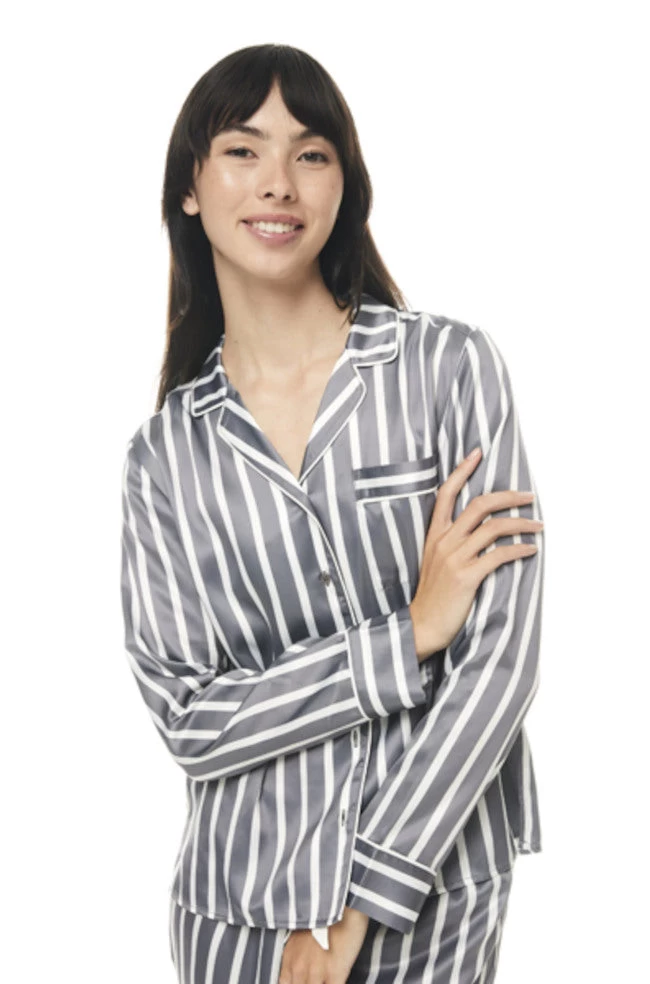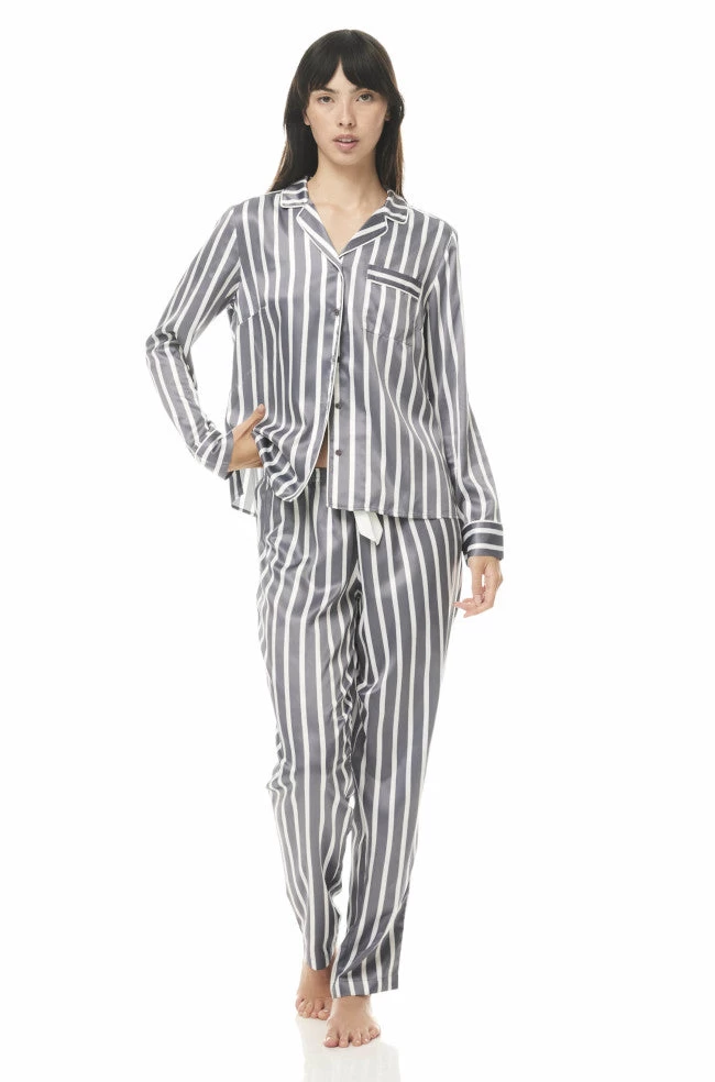 Gingerlilly bring you the luxurious Lotus loungewear set for this season. This exquisite set features a gorgeous grey with white stripe satin fabric, perfect for a peaceful night’s sleep. The button-through top offers style and comfort, while the elasticated waist and drawstring on the pant provide a perfect fit. The Lotus Loungewear set is an ideal gift for yourself or someone special. Indulge in the ultimate sleeping experience with Gingerlilly’s Lotus Loungewear set.