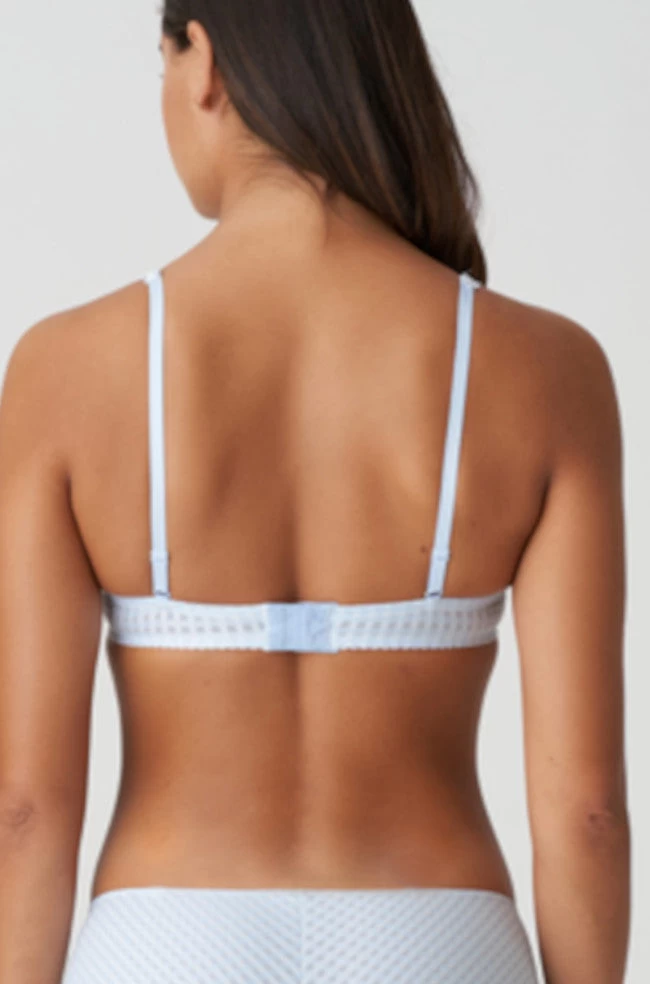 The Avero UW T-Shirt Bra by Marie Jo in a pale blue is a pre-formed padded balcony bra. The center panel between the breasts sits a little higher. Wear the straps straight over the shoulders or around the neck. Team with the