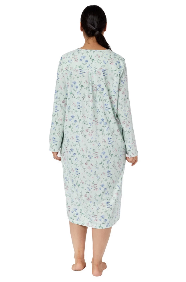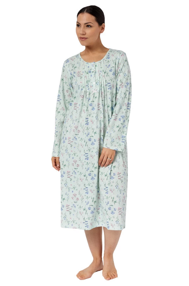 Meadow Cotton Pleated Nightie by Schrank in a lovely sage floral print. Calf length and featuring a round neckline and long sleeves. Available in sizes 10-26.