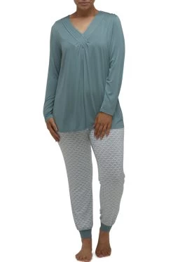 Mineral V-Neck PJ Set in a sage & ivory colour combination by YUU is manufactured in a stretchy, soft lightweight viscose (95%) and elastane (5%) fabric blend. The top has a pleated v-neckline and the bottoms have an elasticated waist. Available in sizes S-2XL.