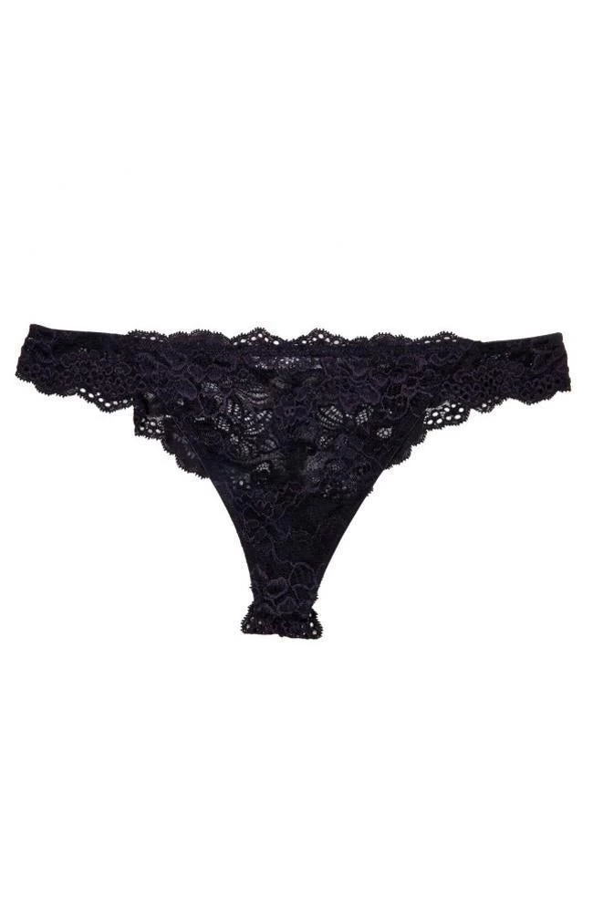 Pleasure State MyFit Thong in black in a semi-sheer lace featuring scalloped edging. Team with