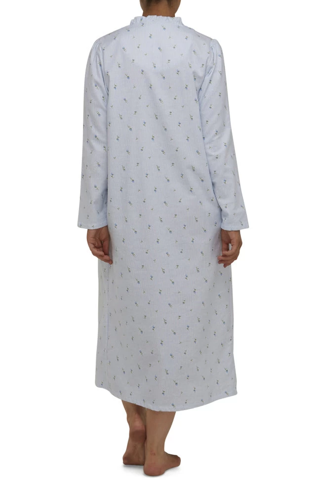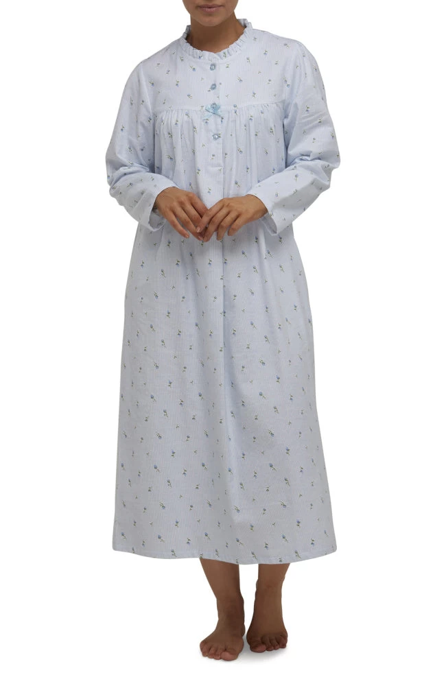 Natalie Long Sleeve Cotton Nightie in a bluefloral print is manufactured in a soft warm cotton fabric. Featuring long sleeves and a pleated round neckline and a buttoned yolke. Available in sizes 10-26.