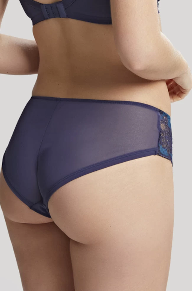 Clara Brief by Panache in a lovely deep ocean colour has a semi-sheer floral lace front with a plain deep ocean coloured back. Team with the