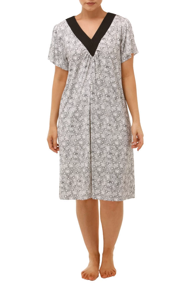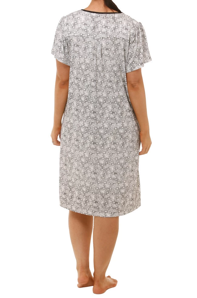 Poppy Short Sleeve Nightie in a black poppy print by YUU is manufactured in a a soft stretchy easy care viscose (95%) and elastane (5%) fabric blend. Great for those warmer nights. Featuring short sleeves and a pleated v-neckline. Available in sizes S-2XL.