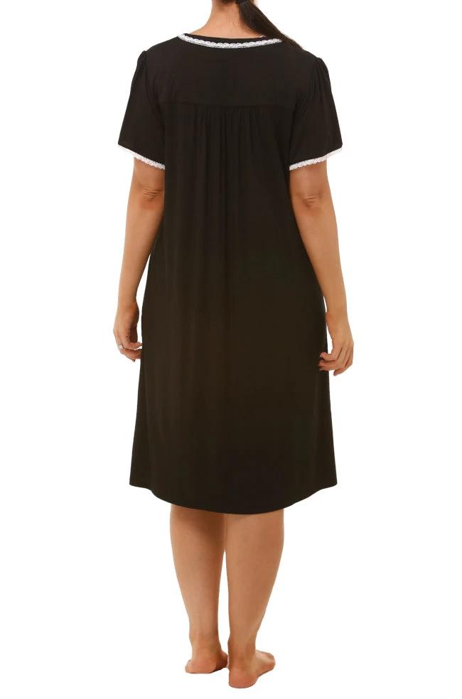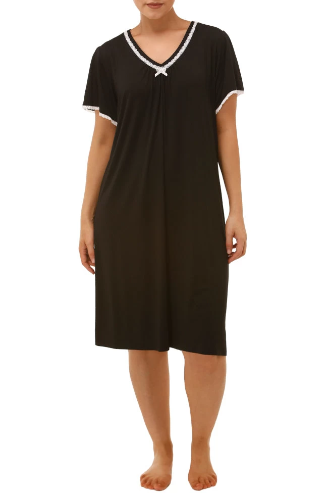 Sleeveless Nightie by YUU in either navy or black is manufactured in a stretchy very soft easy care viscose (95%) and Elastane (5%) fabric blend with polyester (100%) trim. Featuring petite lace trim and a v-neckline and available in sizes S-2XL.