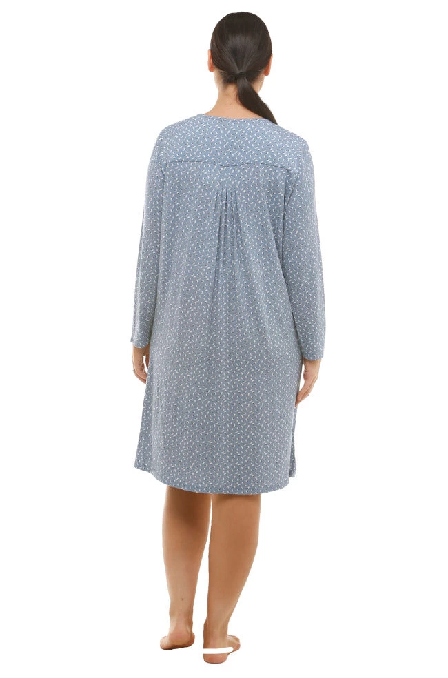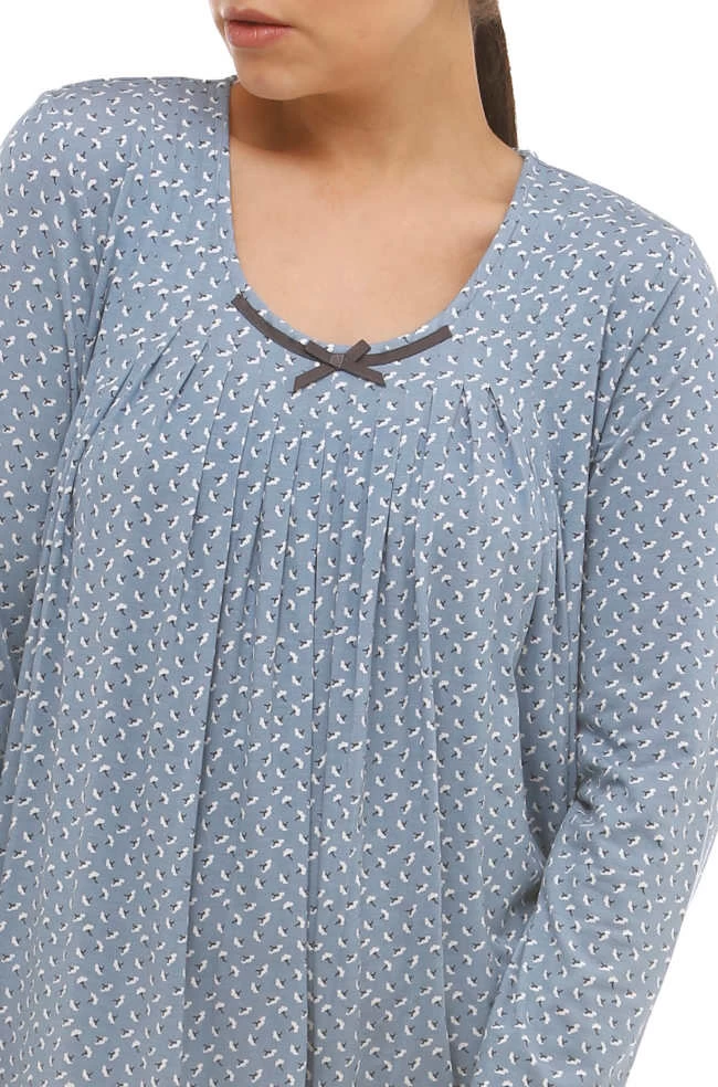 Storm Nightie by YUU in a petite modern blue print is manufactured in a lightweight stretchy viscose (95%) and elastane (5%) print. Featuring a round neckline, contrasting trim and a petite bow.